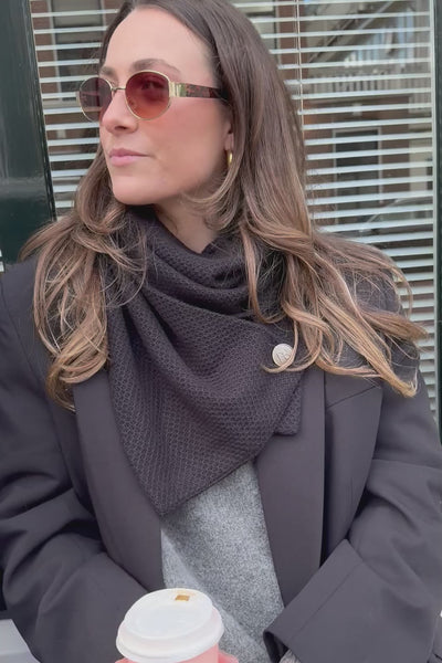 הגוון השחור העמוק והאלגנטי, יחד עם טקסטורת המעוינים העשירה, יוצרים מראה יוקרתי, נקי ועל-זמני שמתאים לכל לוק – מהיומיומי ועד לאירוע ערב. הצעיף מעוטר בכפתור לוגו איטלקי, חותמת עיצוב יוקרתית שמוסיפה נגיעה מדויקת של סטייל.