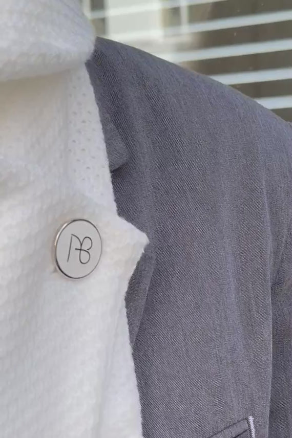 הטקסטורה הסרוגה במעוינים והגוון שמנת האלגנטי יוצרים מראה נקי, על-זמני ושיקי עם נגיעה צרפתית יוקרתית. הצעיף מעוטר בכפתור אמייל לבן במסגרת כסף – חותמת יוקרתית שמוסיפה טאצ’ מדויק ומוקפד.