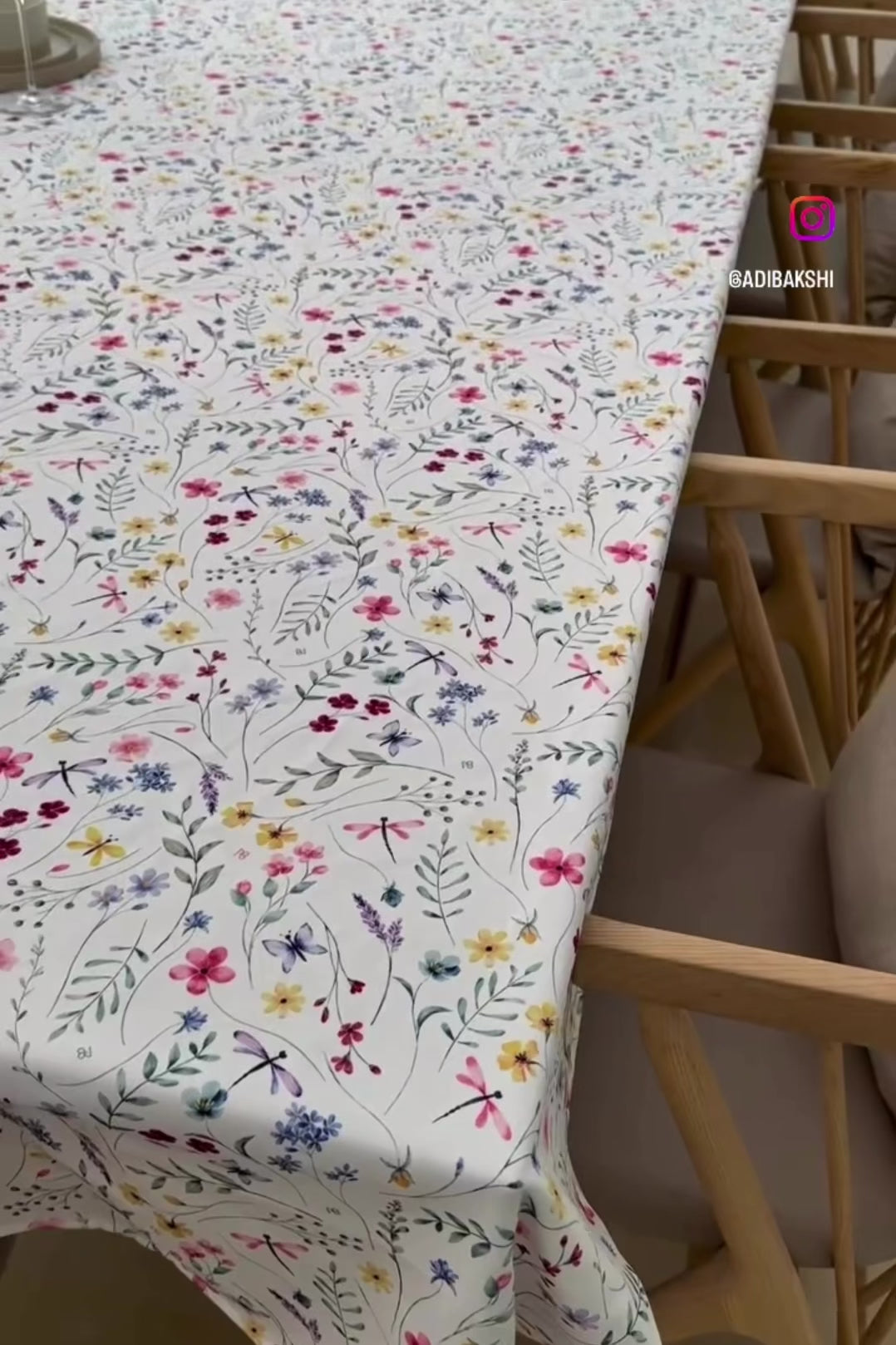 מפת שולחן מעוצבת בהדפס עדין ומרהיב של פרחים, פרפרים ושפיריות. צבעי פסטל רכים על רקע לבן שמנתי מעניקים לשולחן מראה יוקרתי, חי ומלא הרמוניה.